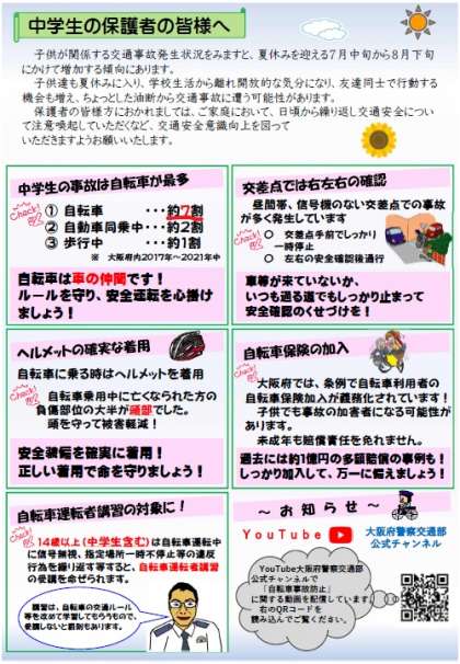 過去5年間の大阪府下における子どもの交通事故は7月中旬から8月下旬にかけて増加傾向です。夏休み気をつけましょう。