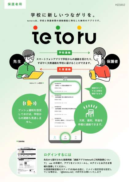 令和5年度より、本市の市立小・中・支援学校と市立幼稚園において、学校と保護者の間の連絡ツールとして、スマートフォンアプリ「tetoru(テトル)」が導入されます。