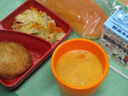 本日4月17日(月)はコッペパン・コロッケ・キャベツのソテー・にんじんのポタージュでした。