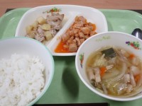 明日5月19日(金)はごはん・さばの塩焼き・じゃがいものいそ煮・鶏そぼろ・野菜の塩こうじ炒めです。