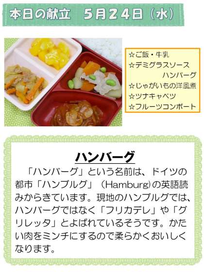 本日5月24日(水)はごはん・デミグラスソースハンバーグ・じゃがいもの洋風煮・ツナキャベツ・フルーツコンポートです。