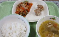 本日5月30日(火)はごはん・豚肉のマスタード焼き・ちんげん菜のソテー・五目汁です。