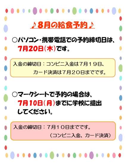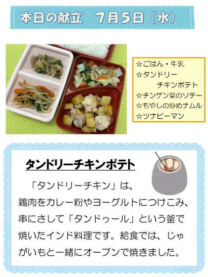 本日の給食 公開日 2023/07/05 更新日 2023/07/01 給食・食育 本日7月5日(水)はごはん・タンドリーチキンポテト・ちんげん菜のソテー・もやしの炒めナムル・ツナピーマンです。 [栄養価](標準の場合) エネルギー752kcal・たんぱく質29.3g・脂質25.0g [アレルギー] 小麦・大豆・ごま・鶏肉・豚肉 7月給食献立表←クリックしてください 8月給食献立表←クリックしてください 9月給食献立表←クリックしてください