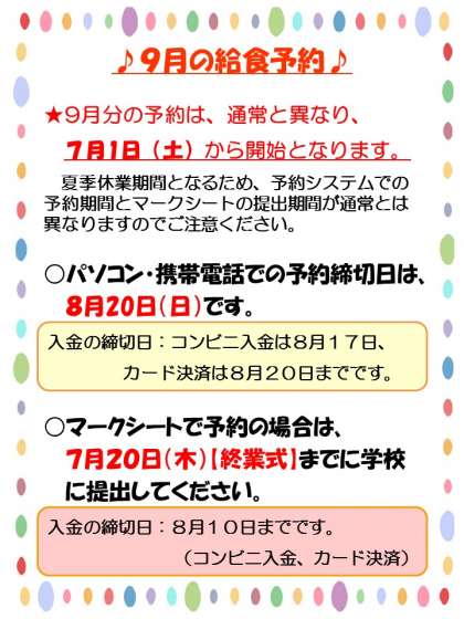 本日の給食 公開日 2023/07/11 更新日 2023/07/01 給食・食育 本日7月11日(火)は1学期最後の給食です。 献立はごはん・夏野菜のカレーライス・ミンチカツ・キャベツのソテーです。 [栄養価](標準の場合) エネルギー845kcal・たんぱく質28.8g・脂質27.8g [アレルギー] 小麦・大豆・豚肉・油 7月給食献立表←クリックしてください 8月給食献立表←クリックしてください 9月給食献立表←クリックしてください