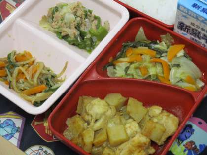 本日7月5日(水)はごはん・タンドリーチキンポテト・ちんげん菜のソテー・もやしの炒めナムル・ツナピーマンでした。
