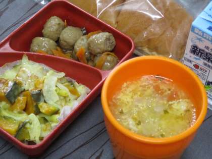 本日7月10日(月)は黒糖パン・かぼちゃのグラタン・肉団子の甘酢煮・トマトと卵のスープでした。