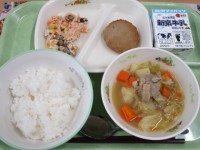本日9月1日(金)はミニココアパン・救給カレー・鶏肉のレモンソース・キャベツのソテーです。