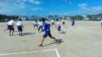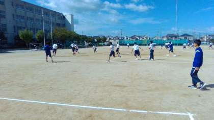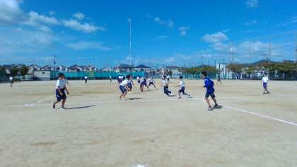 大人の世界ではW杯決勝T出場をかけた予選最終戦を週末に控えた今週、3年男子の体育ではラグビーを行っています。テレビ等で優れたプレーを見ているからでしょうか、生徒たちは楕円球にさほど抵抗なくプレーしているようです。腰からぶら下げた紐を取り合うことで、ぶつかるプレーの代替としています。