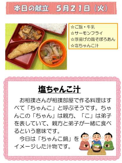 本日5月21日(火)はごはん・サーモンフライ・厚揚げの鶏そぼろあん・塩ちゃんこ汁です。