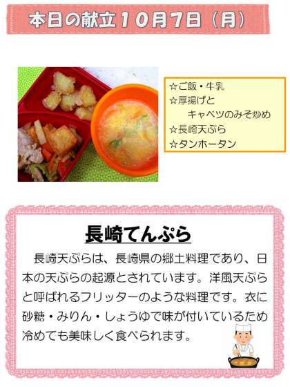 本日の給食 公開日 2024/10/07 更新日 2024/10/02 給食・食育 本日10月7日(月)はごはん・厚揚げとキャベツのみそ炒め・長崎天ぷら・タンホータンです。 [栄養価](標準の場合) エネルギー826kcal・たんぱく質29.2g・脂質25.2g [アレルギー] 卵・小麦・大豆・鶏肉・豚肉・油 10月給食献立表←クリックしてください 11月給食献立表←クリックしてください