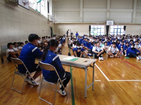 体育館での実施でしたが、みなさん暑い中しっかり集中して話をきいていました。