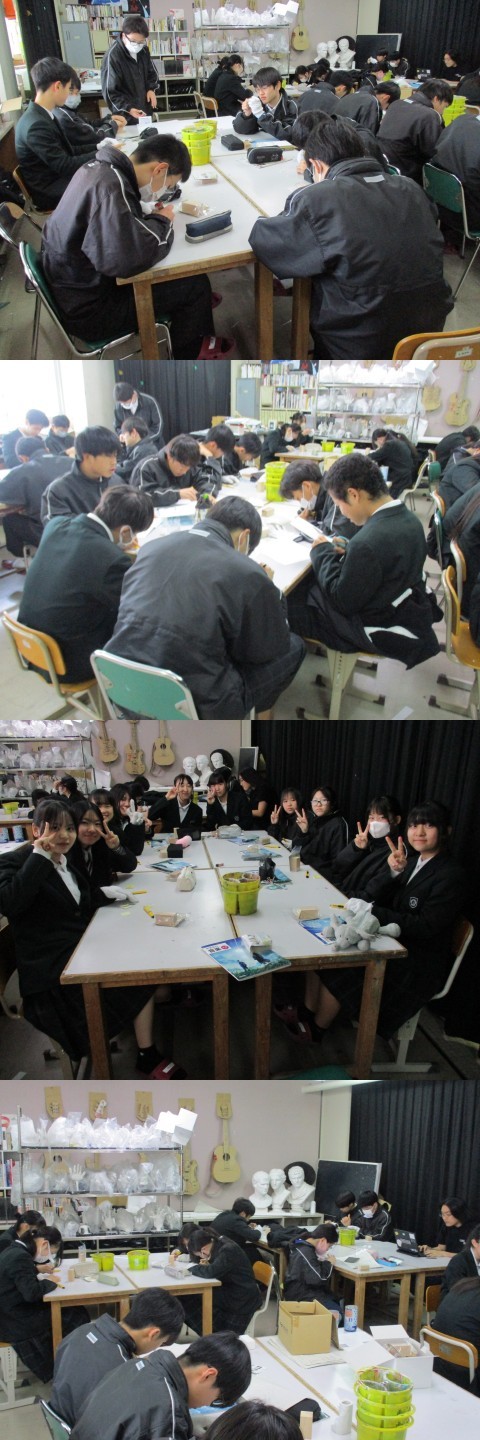 美術。一文字ひと文字に思いを込めながら、集中して篆刻づくりに取り組んでいます。下絵づくりから彫りの作業まで、真剣な表情で丁寧に仕上げています。篆刻の作成をしています。