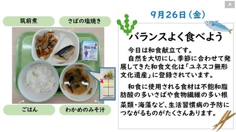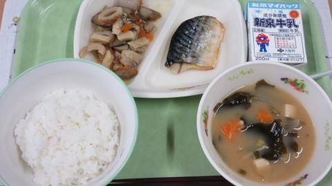 本日9月26日(金)はごはん・牛乳・さばの塩焼き・筑前煮・わかめのみそ汁です。