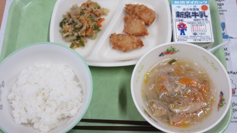 本日9月29日(月)はごはん・牛乳・鶏肉のから揚げ・ツナピーマン・春雨スープです。