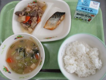 本日11月18日(火)は、ごはん・牛乳・さばの塩こうじ焼き・いも煮・小松菜のみそ汁です。
