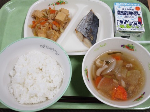 本日12月12日(金)は、ごはん・牛乳・さばの塩焼き・じゃがいものいそ煮・五目汁です。