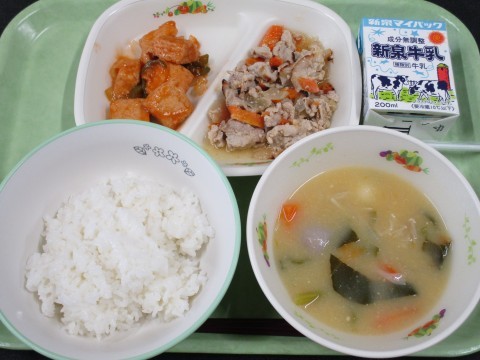 本日1月27日(火)は、ご飯・牛乳・鶏肉のから揚げ・千切りイリチー・四川風スープです。