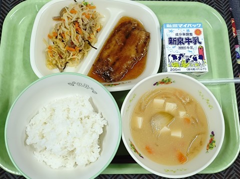 本日3月18日(水)は、ご飯・牛乳・いわしのかば焼風・千切りイリチー・みそ汁です。