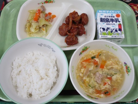 献立は、ご飯・牛乳・ミートボールのソースかけ・キャベツのペペロンチーノ・卵スープです。