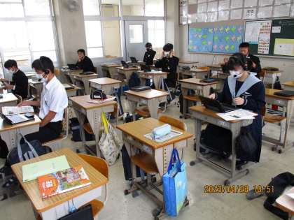 生徒たちは慣れない方法のテストに緊張していましたが、これまで培った能力を使って回答にトライしていました。なお、隣の人の回答が聞こえないよう、またネットワーク負荷やサポート体制を考慮して学級を3分割して順番に受検しています。 -