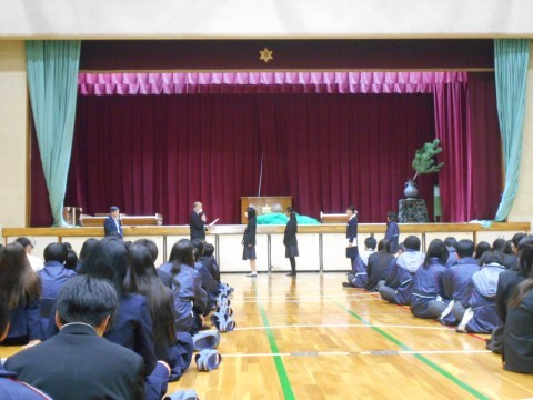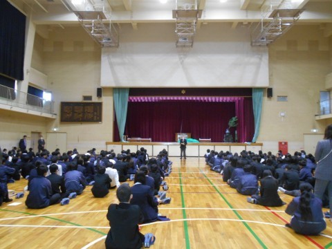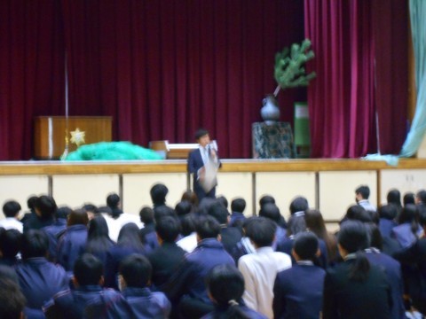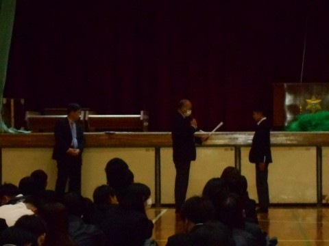 表彰の後、校長先生・生徒指導主事の先生からお話があり、生徒たちは真剣な表情で耳を傾けていました。