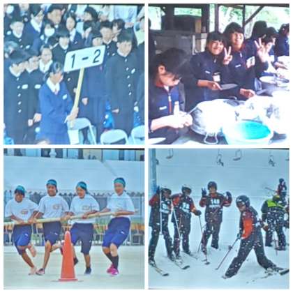 3年生を送る会の最後は、3年生の先生方が編集した75期生の入学から現在に至るまでをスライドでつなぐ映像でした。入学式時のあどけない表情が見られた笑いの画像に始まり、体育大会や校外学習、スキー実習やいつもの学校生活の場面などが、3年間凝縮されていました。特に、3年生の集大成で演奏したコーラスコンクールは、各クラスのスライドだけでなく、本番に収録した音声も同時に流されてました。