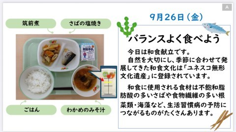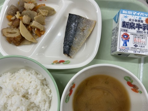 ○ご飯○さばの塩焼き○筑前煮○わかめのみそ汁○牛乳 でした。