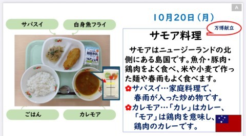 万博は終わりましたが今日の給食は万博参加国の料理でした。「カレモア」や「サパスイ」は初めて聞いた名前の料理だったと思いますが、おかわりをしてる人が多かったです。
