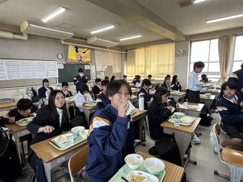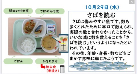 ○ご飯○豚肉の甘辛煮○さばのみそ煮○かきたま汁○牛乳 でした。
