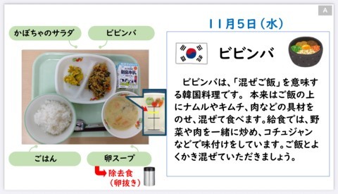 ○ご飯○ビビンバ○かぼちゃのサラダ○卵スープ○牛乳 でした。