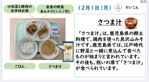 ○ご飯○赤魚の野菜あんかけ○小松菜と豚肉の甘辛炒め煮○さつま汁○牛乳 でした。