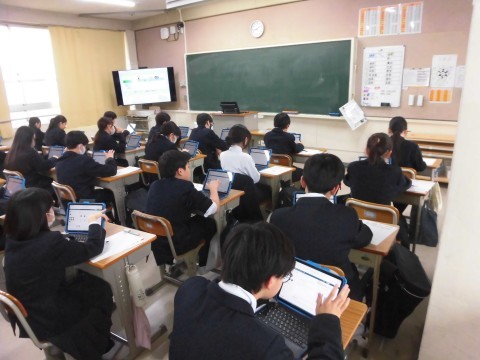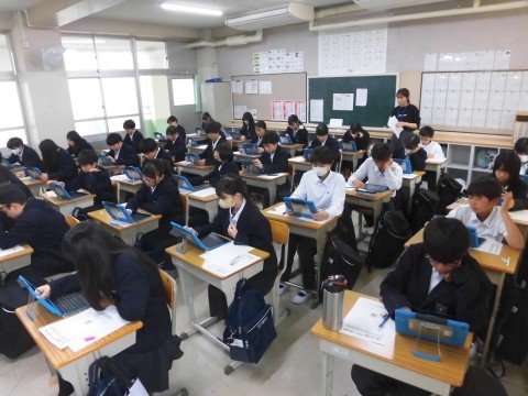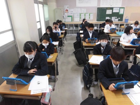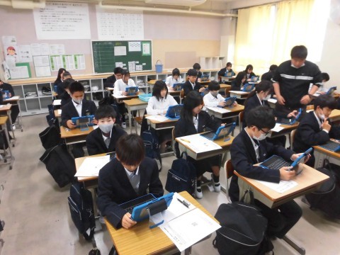 5月の下旬に「堺市学力調査」があり、1年生・2年生の生徒は自分のPCで回答します。1年生は本日の5時間目に、その学力調査の操作練習をしました。
