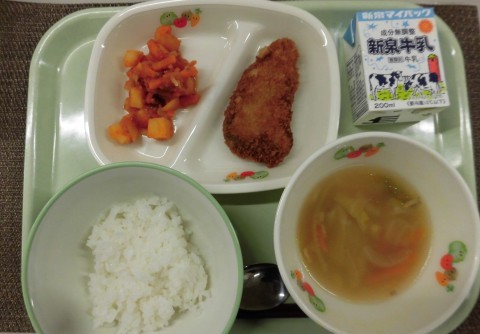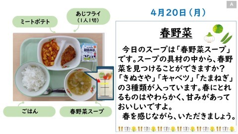 ☆ごはん・あじフライ・ミートポテト・春野菜スープ・牛乳 でした。