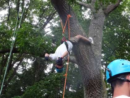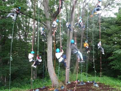 ロープ一本で大きな木の枝に登ります。コツを掴み、みんな高くまで登ることができるように