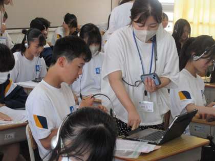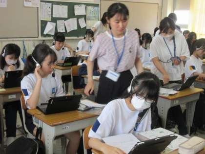 2年生でオンラインの英会話授業が行われました。いつもと違う授業にヘッドホンを付けて少し戸惑い気味でしたが、しっかり取り組んでいました。