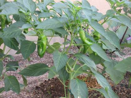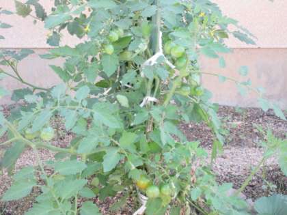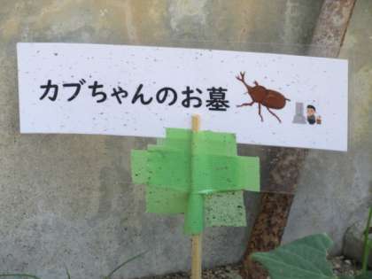 トマト、ピーマンが実っています。その横には先日亡くなったカブトムシのお墓が作られていました。