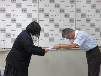 3時間目に終業式が行われました。初めに陸上部とドリームクラブの柔道部に表彰状の伝達がありました。柔道部の須賀さんは近畿大会、全国大会にも大阪府代表として出場します。そのあと校長と生徒指導主事よりお話がありました。