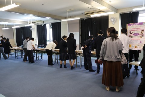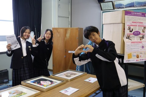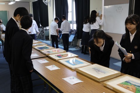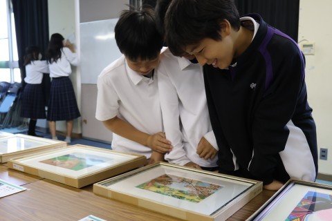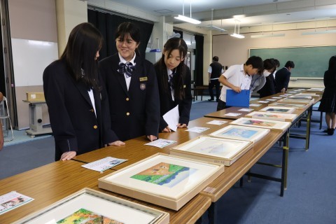 病気や事故で両うでの自由を失い,障がいがありながらも,口や足に筆をはさんで絵を描くことで社会参画し,自分の力を発揮している人たちが世界中にいます。ぜひ,自分の目で心に響くアートを鑑賞してもらいたいとの思いで開催しました。多くの生徒や保護者の方々に熱心に見ていただき,「この人,足に筆はさんで絵描いてる!」など,驚きや感動の声があがっていました。