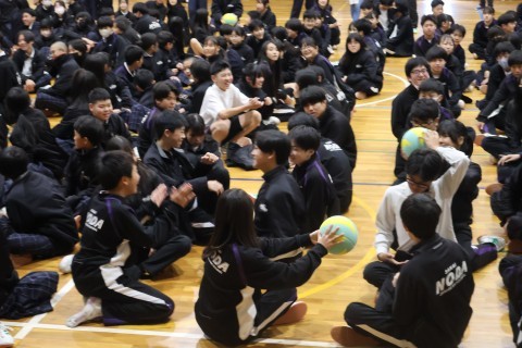 終了時に前に出ている人数の少なかった方のクラスが勝ちです。」というものですが,急いでボールをまわし,音楽が止まった瞬間,体育館中に「うわ~っ」と,どよめきがわいていました。