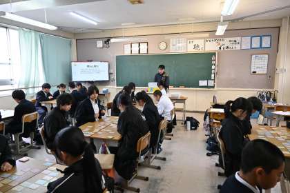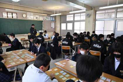 国語の授業です。百人一首(かるた取り)をしています。