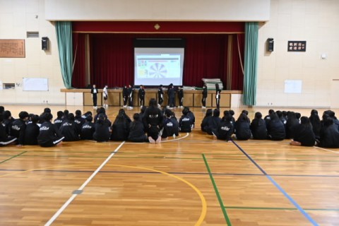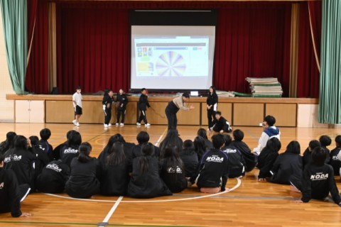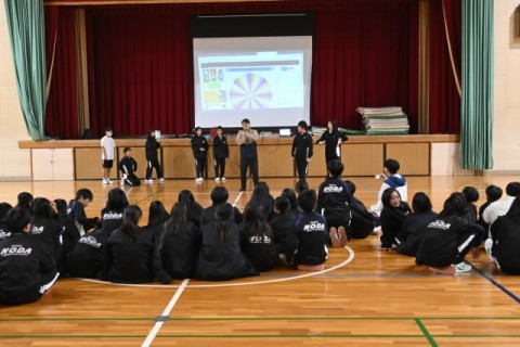 代表の生徒が考えてくれたゲームを,自分たちが進行しながらみんなで楽しんでいました(先生たちは,見守っています)。工夫を凝らしてみんなが楽しめることを考えることは,今後の中学校生活でも役に立つと思います。