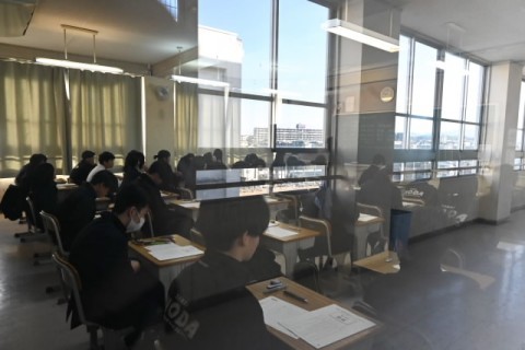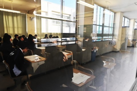 本日は,大阪府のチャレンジテスト実施日です。1,2年生は,朝からテストに取り組んでいます。写真は,1年1,2組です。テストの開始前に先生方の説明を聞いているところです。