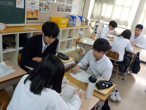 ふくなん学級です。2時間目の大阪府チャレンジテスト社会科に向けて特訓中です。