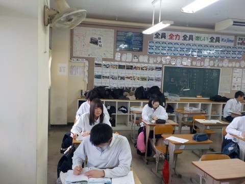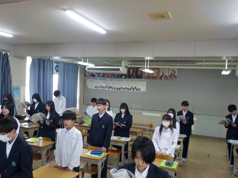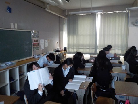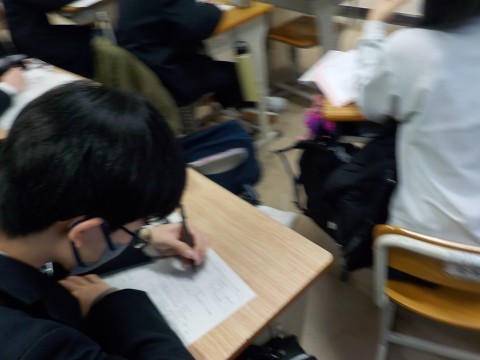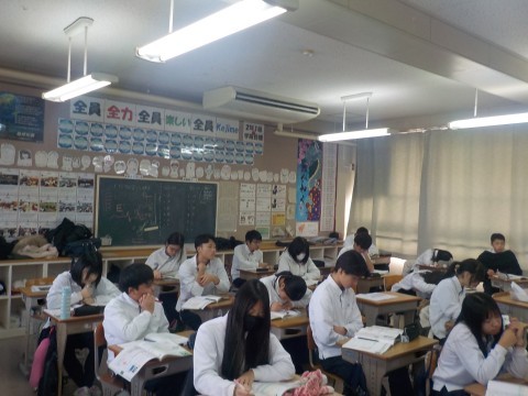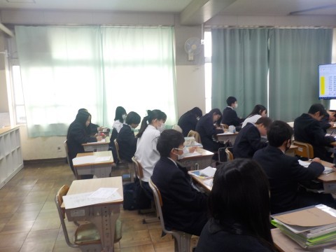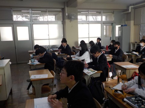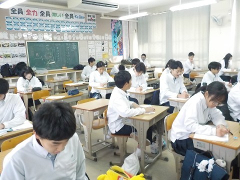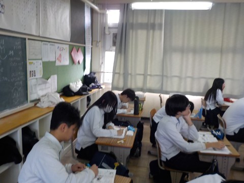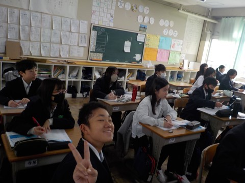3年生です。いよいよ来週火曜日が私立高校入試です(一部高校では水曜日の祝日に面接が行われます)。仕上げを行うとともに,是非体調に気を付けて土日を過ごしてほしいです。「天は自ら助くる者を助く(God helps those who help themselves)」のことわざ通り,最後まで諦めず努力しましょう!