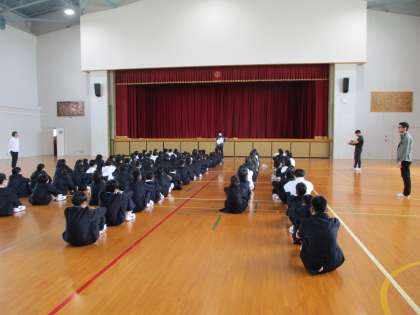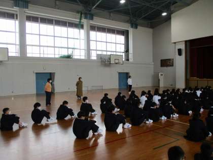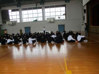 1年生の学年集会です。学年生徒指導の先生から,学校生活の基本ルールのお話がありました。