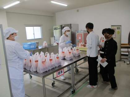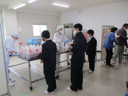 今日から昼食持参になります。給食の人は配膳室に取りに来ています。1年生は初めてなので,先生たちがサポートしています。礼儀正しく受け取っていました。