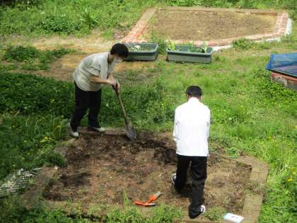 ふくなん学級で,学校農園の整備です。先生と一緒に耕してくれています。中庭のつつじも満開です。