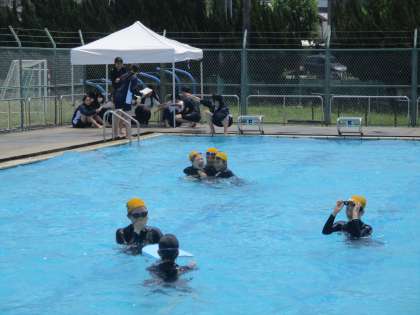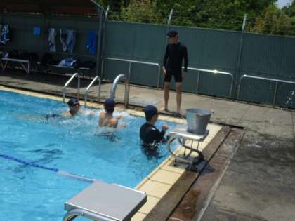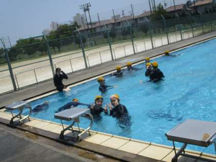 水泳の授業です。今日は気温が高いので、水の中は快適なようです。