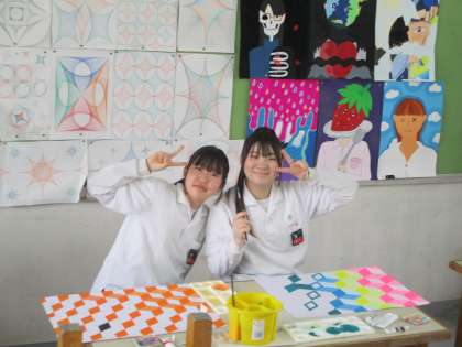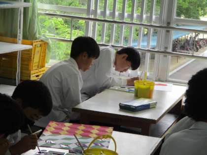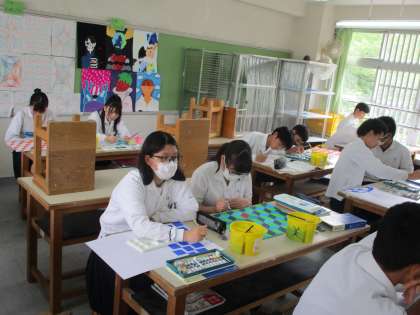 授業風景です。美術の授業では、自分が描いたデザインに色付け中でした。