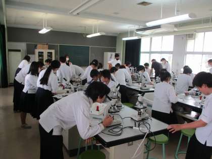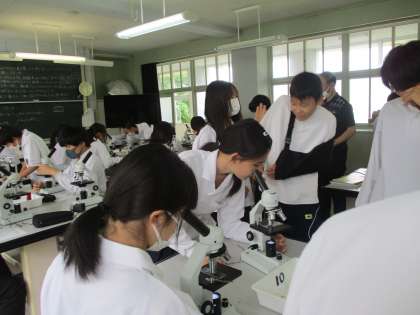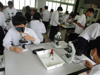 理科の授業の様子です。顕微鏡で観察を行っています。